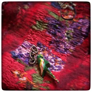 Pour ses bijoux, ce sont des tissus, des boutons, des perles qu’elle mêle à des fils crochetés, à des anneaux polis, dépolis, transformés. Chaque oeuvre a une histoire où l’une de ses grands-mères est présente. Ces femmes italiennes, couturières et brodeuses lui ont transmis la passion de la matière, du travail de l’artisan, le goût de l’imaginaire et tout simplement du beau. Originaire de Naples et de Sicile, sa famille a émigré en Belgique dans les années soixante et c’est toute cette tradition familiale, transformée par le temps au gré de son inspiration qui s’exprime dans ses créations. Son intention? Magnifier la beauté de la personne qui portera le bijou.