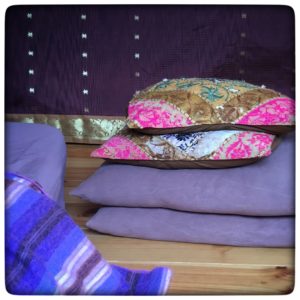 Les couleurs des galets, des plumes et des pommes de pin côtoient les éclats rose et violet des textiles du grenier, espace de méditation qui sent bon le calme et le voyage.