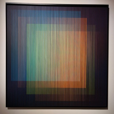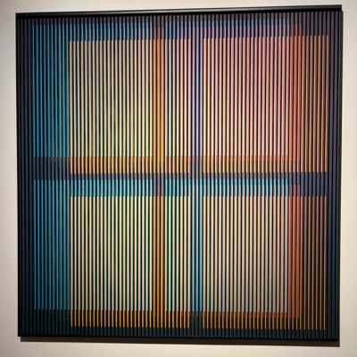 Le rapprochement et l’éloignement quant à lui permet d’expérimenter le phénomène d’assimilation des couleurs, qui a tendance à rapprocher les couleurs constituantes, si bien que lorsque la couleur du plan du tableau varie, on est persuadé (à tort) que la couleur de la latte qui la jouxte diffère également. Le déplacement vis-à-vis de l’oeuvre exploite aussi la persistance rétinienne, ce phénomène qui engendre la perception de la couleur complémentaire à celle à laquelle on vient d’être exposé. Ici, cette couleur virtuelle se combine à la vision de la couleur nouvellement présente aux yeux du spectateur, processus savamment élaboré par l’artiste. Tous les phénomènes physiques et perceptifs sont convoités pour nous faire percevoir des couleurs qui ne sont pas présentes dans le support physique de l’oeuvre tout en générant une palette d’affects que nous ne maîtrisons pas.