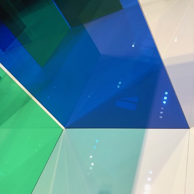 Les théories soustractive et additive de la couleur trouvent ici des illustrations accessibles à tous: les panneaux filtrant la lumière réalisent la synthèse soustractive tandis que les ombres et les reflets, en se superposant, produisent de nouvelles couleurs en synthèse additive.