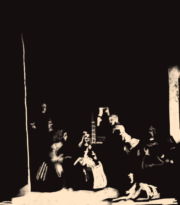 Dans cet exemple « les Ménines » de Vélasquez, j’ai identifié une série de zones plus claires que l’ensemble. Dans un second temps, sur un fond noir, je me suis contentée de passer rapidement un pastel blanc (digital) sur celles identifiées comme claires. Après coup il ma semblé que le peintre, situé un peu en arrière-plan à gauche, devait aussi être souligné par du pastel alors qu’initialement je ne l’avais pas noté.