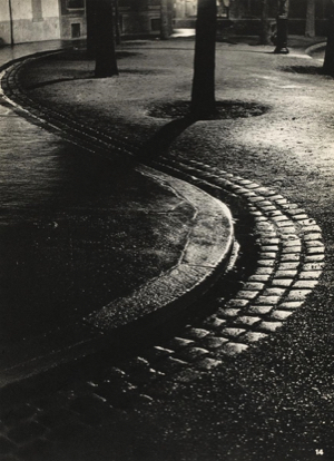 La série « Paris la nuit » de Brassaï est un bel exemple de l’usage du clair-obscur pour le paysage; regardez comment l’éclairage saisit le relief des pavés, les textures différentes de la route et des trottoirs; l’humidité nous traverse pratiquement la peau.