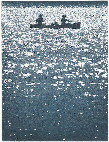 Dans l’aquatinte ci-dessous, nous contemplons le miroitement de la lumière à la surface du lac, comme si nous partagions sa barque.