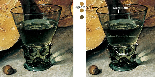 Parfois, une simple ligne dans une zone de même teinte, et tout le relief apparaît: devant le fromage la ligne qui représente l’ouverture du verre est foncée, tandis que juste en face du spectateur, elle est claire. Le fromage est légèrement plus foncé quand il apparaît derrière une épaisseur de verre, et plus verdâtre derrière deux épaisseurs.