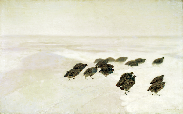Plusieurs tableaux du peintre allemand Walter Moras (1856-1925) dépeignent la neige. Dans celui-ci où le pin est en contre-jour, on croirait entendre la neige fondre sous le soleil. Il a réussi, rien que par sa palette de blancs, à traduire la qualité de cette neige que le soleil réchauffe. Observez ci-dessous comment le peintre russe Alexandre Borissov (1866-1934) et le polonaisJózef Chełmoński (1849-1914) font ressentir l’un le froid, l’autre le vent glacé.