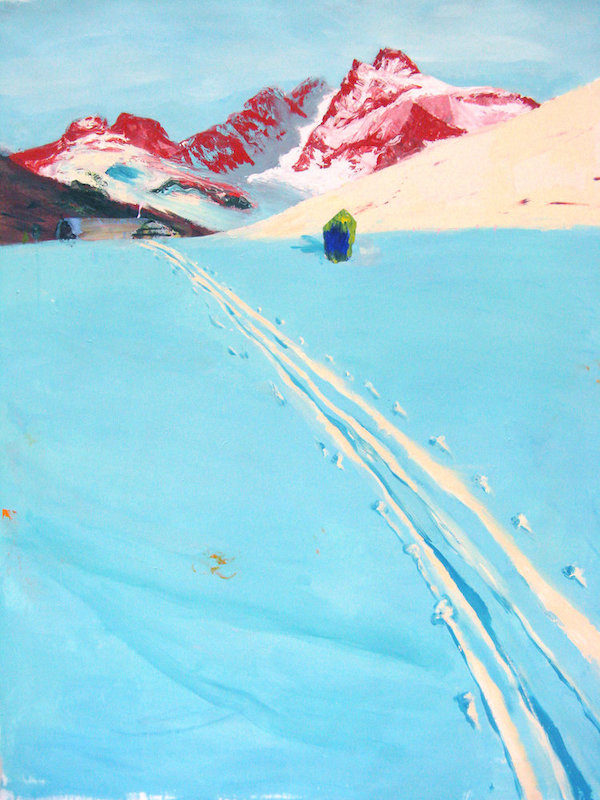 Judith Simonian que vous aurez découverte dans le défi #4 revient avec une paire étonnante de complémentaires rouge-bleu pour ce paysage de montagne intitulé « La piste bleu glacé ». Elle a pris au mot le qualificatif « bleu glacé ». Le tableau de Rick Stevens aurait pu figurer dans le défi sur l’heure bleue; il n’hésite pas non plus à nous donner une neige dans une gamme de bleus brillants, caractéristique de notre vision mésopique.