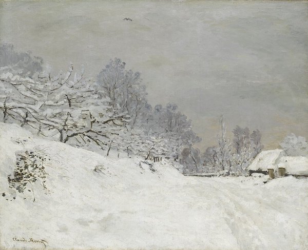 Différentes conditions météorologiques révèlent de nouvelles palettes. Douceur des gris que la lumière vespérale colore ici de rose, là de bleu ou de vert dans ce paysage du peintre allemand Paul Müller-Kaempff (1861-1941). Le peintre romantique Caspar David Friedrich (1774-1840) quant à lui nous laisse deviner à travers les frimats une église comme un écho au sapin situé à l’avant-plan; la neige y est déclinée en des tons s’assombrissant dans un dégradé de gris bleutés fondus dans le brouillard. Un voile de brume plus léger enveloppe le paysage de Richard Freiherr von Drasche-Wartinberg (1850-1923).