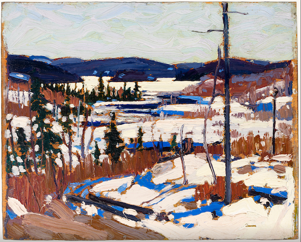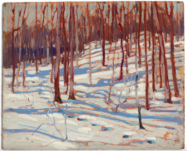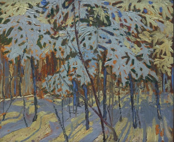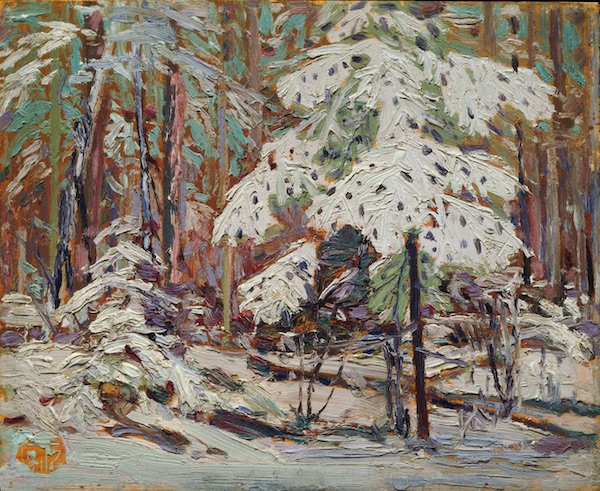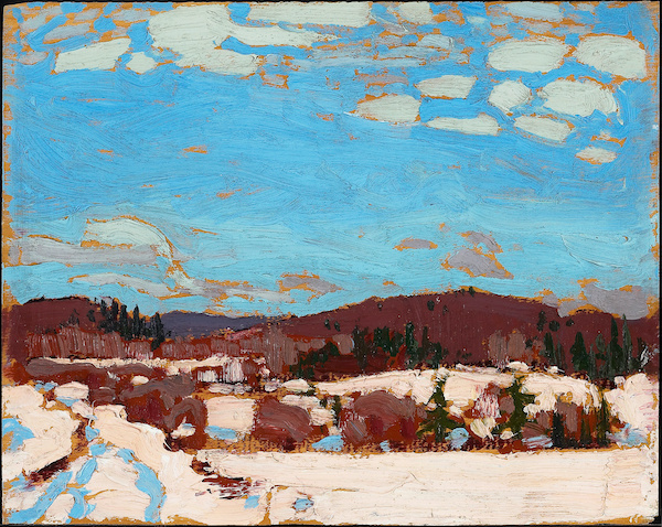 Les Canadiens me pardonneront de me limiter dans cet article au travail de Tom Thompson (1877-1917), la figure la plus emblématique du groupe des sept, même s’il n’en fait pas partie au départ. Il est incontestablement un grand coloriste. Observez dans les pochades qui suivent toutes les teintes que prennent les blancs et l’audace des couleurs dans les ombres. Ce travail synthétique qui est à la peinture ce qu’est le sketch à l’art du dessin saisit avec brio la nature canadienne en hiver.