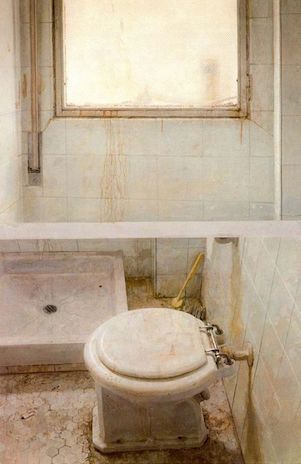 Antonio López García (né en 1936), dessinateur hors-pair, est un peintre et sculpteur d’une très grande sensibilité. Ses tableaux, en général de très grande taille, nous projettent au-delà du réel. Sa série de salles de bain crée un sentiment étrange chez le spectateur. Si le blanc est bien la couleur du « propre », l’idéal d’une salle de bain nickel, il est utilisé ici à contre-sens.