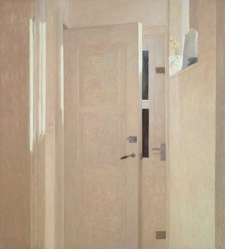 Ci-dessus, le jeu des portes, l’une ouverte, l’autre fermée et celui des rais de lumière projetés sur le mur et sur les reliefs du chambranle, rythment cet ensemble blanc souligné par deux rectangles gris foncé. La transparence d’un vase en cristal taillé, posé sur l’appui de fenêtre en hauteur, se manifeste ici par le blanc le plus pur et le plus clair du tableau. Les jonquilles qui l’occupent constituent la seule touche chromatique ou en tout cas perçue comme telle.