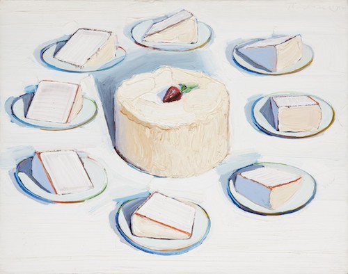 Dans un style plus ludique, ci-dessous, les gâteaux blancs de Wayne Thiebaud (né en 1920); observez le glaçage légèrement bleuté dans l’ombre. Remarquez encore comment la couleur ajoutée au blanc donne une indication du volume et de l’orientation des surfaces. Les bords colorés des assiettes participent au côté festif de cette table et les traits rouges dans les gâteaux les rendent plus appétissants.