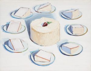 Wayne Thiebaud, Around the Cakes, 1962. Oil on canvas, 22 1/8 x 28 1/16 in. (56.2 x 71.2 cm). Spencer Museum of Art, University of Kansas, Lawrence, Gift of Ralph T. Coe in memory of Helen Foresman Spencer; Art © Wayne Thiebaud / Licensed by VAGA, New York, NY.