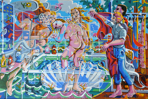 Le peintre François Boisrond (né en 1959) s’est approprié une série de peintures en les transformant dans un style très personnel. Quoique éloignées des œuvres originales ses créations nous semblent familières et nouvelles à la fois. Des couleurs plus vives, une facture simplifiée et une écriture graphique donnent un coup de jeune à « Moïse sauvé des eaux » de Poussin, au « déjeuner sur l’herbe » de Manet, à « Diane Charesse » (de l’école de Fontainebleau?), et ci-dessous, à « La naissance de Vénus ».