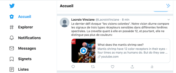 Si vous suivez @LacroixVinciane sur Twitter vous serez également avertis des nouvelles publications d’articles du blog. De plus, via ce réseau, je réserve la communication de contenu plus scientifique en rapport avec les articles, et de manière plus générale à la vision de la couleur. Par exemple, dans le défi #15 sur les fleurs, j’évoque les différents types de visions colorées; je fais référence aux 12 différents récepteurs de la crevette Mantis. Mais voit-elle pour autant plus de couleurs? Sur Twitter, je donne un lien vers une vidéo (en anglais) qui répond à la question.