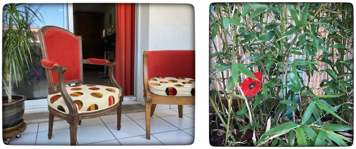 Sur la petite terrasse de son appartement on apprécie la douceur des soirées d’été. Un faux coquelicot rouge pointe sa frimousse au milieu de quelques plantes vertes. D’anciens fauteuils garnis d’une nouvelle jeunesse accueillent les amis autour d’un verre.
