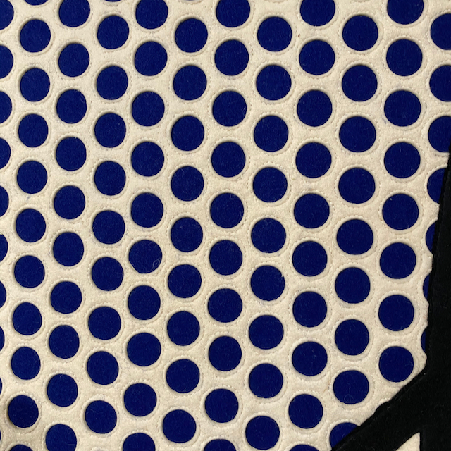La dernière salle de l’exposition partage les recherches de l’artiste en terme de matériaux. Tantôt on découvre des tapisseries où le feutre apporte une touche visuelle caractéristique, tantôt il s’agit de céramique ou encore d’acier inoxidable. Le Rowlux reste cependant un de ses supports favoris.