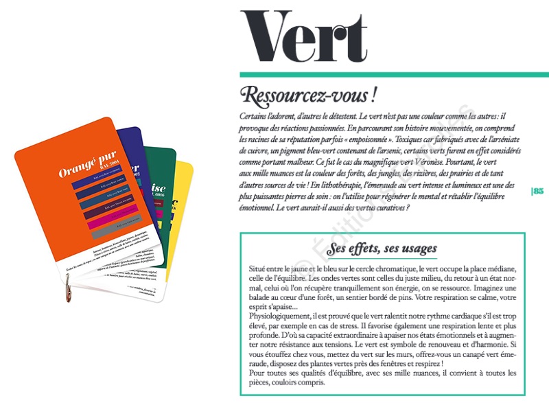 À gauche le nuancier déco-box. À droite, fiche descriptive du vert: il apaise, augmente notre résistance aux tensions, il est le symbole de du renouveau et l’harmonie