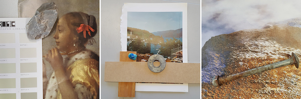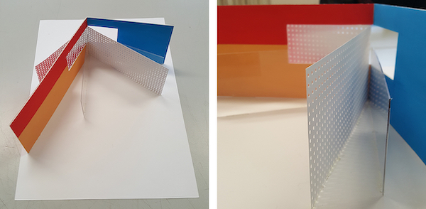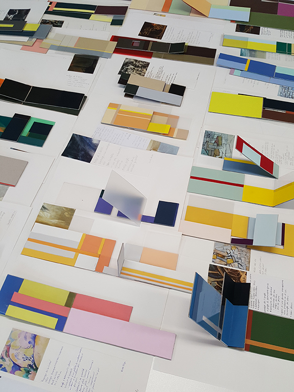 L’exercice permettant d’explorer ces aspects-là, exercice récent mis au point avec mon jeune collègue Maxence Mathieu, consiste à articuler 2 angles, l’un en carton recouvert d’aplats de couleur, lisses, texturés, l’autre en matériaux colorés, translucides, ajourés, etc.