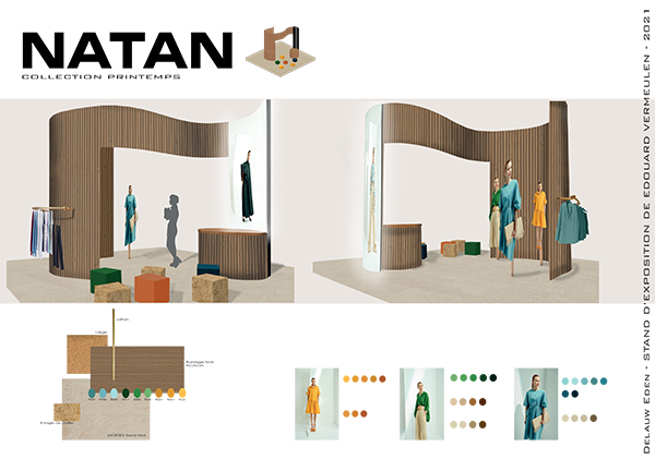 Quelques projets fonctionnels, en guise d’exercices de synthèse, sont étudiés dans le cadre du cours de Couleur. Par exemple, en 1ère année, un stand d’exposition de tissus d’ameublement ou de papiers peints d’une marque précise, ou encore d’un styliste.