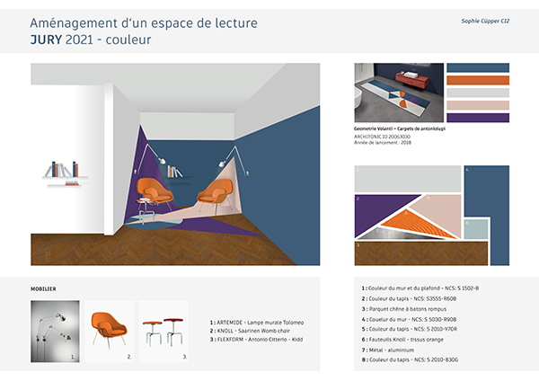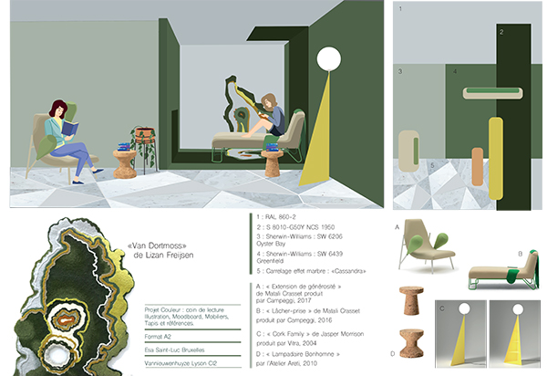En 2ième année, le projet présenté ci-après consiste en l’aménagement d’un petit espace dédié à une fonction: la lecture de livres ou de magazines dont le style (magazines de mode, bandes dessinées, livres d’art ou essais philosophiques…) pouvait être à la source de leur inspiration afin de créer une ambiance cohérente et propice à cette activité. S’ajoutait comme contrainte celle du choix d’un tapis dont les étudiants s’inspiraient pour la palette des couleurs, les motifs, la sélection du mobilier.
