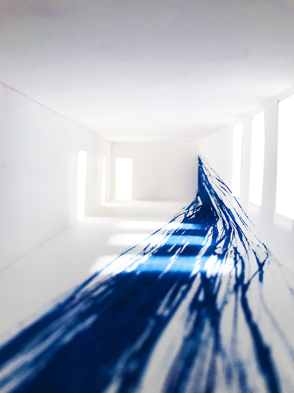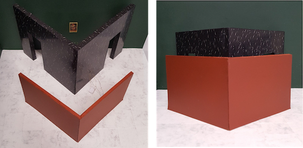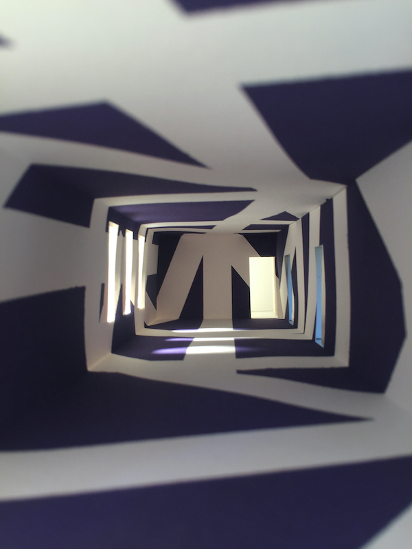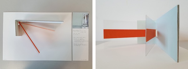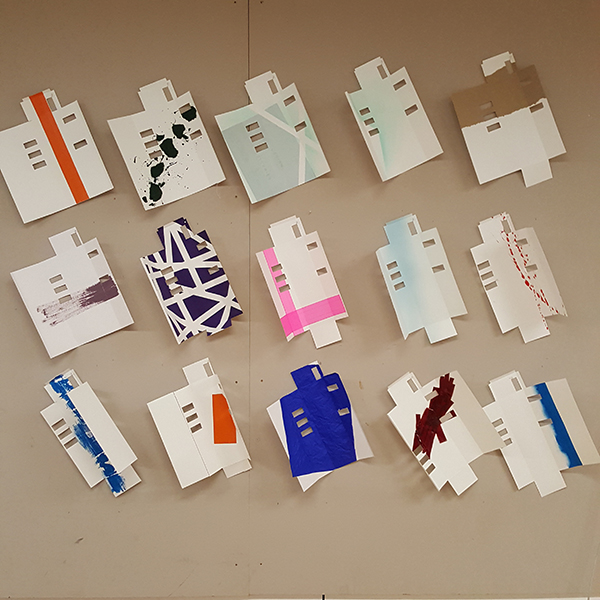 Sans expliquer immédiatement aux étudiants l’objectif final, je leur demande d’appliquer une couleur, très librement, avec n’importe quel matériau, sur une feuille de papier, ensuite de découper cette feuille selon un développement imposé, développement qu’ils replieront de façon à créer une boîte dont l’intérieur s’apparente étrangement à un espace réel. Cette boîte, percée de « fenêtres », exposée de diverses manières à la lumière du jour ou artificielle, est photographiée. Le résultat est souvent « bluffant », c’est comme si on était dedans.