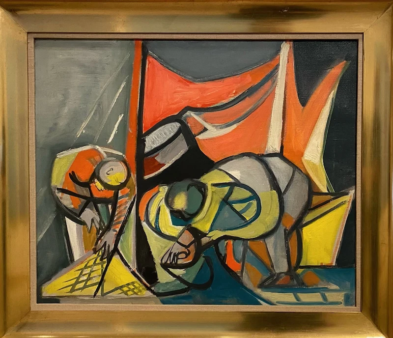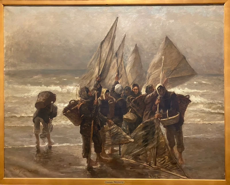 Je connais par ailleurs Constantin Meunier sculpteur, mais découvre ici le peintre. Certes, les tons tristes des Pêcheuses de crevettes à Mariakerke ne sont pas pour nous réjouir, mais quelle présence dans ces personnages affrontant les éléments! En quelques traits de pinceau les voilà campés, solides comme des sculptures. Quel contraste avec la vision tout aussi intéressante d’Edouard Pignon! Dans sa proposition quasi abstraite du même sujet, il oppose un orange vif et des jaunes sur un fond gris. Et pourtant, le temps maussade transparaît tout autant.