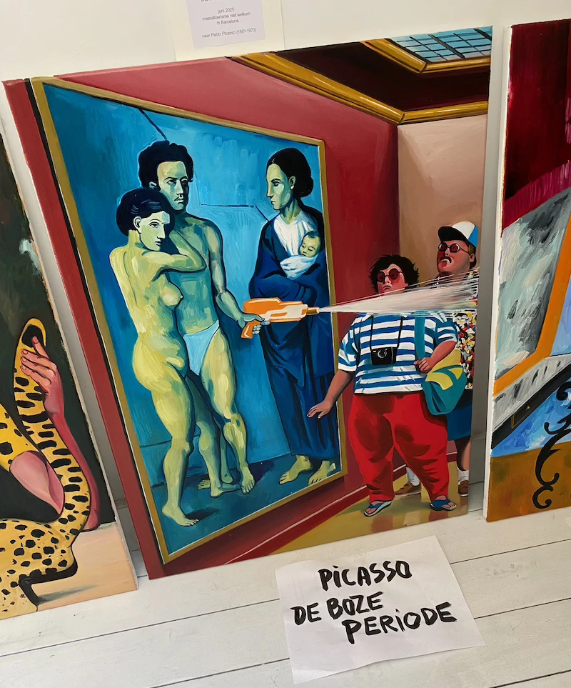 Je suis moins sensible à l’univers de Kamagurka, pourtant choisi pour l’affiche. Quant à Herr Seele, il clôt le parcours avec des peintures pseudo-classiques, joyeusement décalées, héritières à la fois des anciens maîtres et du surréalisme belge. Certaines satires — Trump ou Musk — sont attendues, mais on sent l’artiste s’amuser, et nous tout autant.