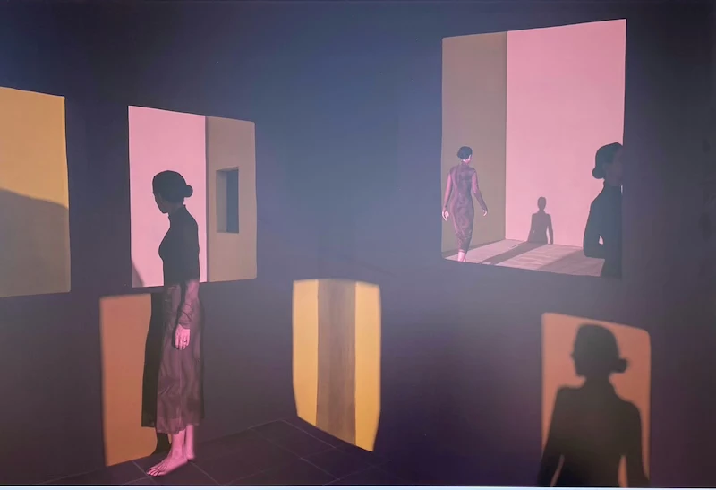Son traitement de la couleur est à l’opposé de celui de Sanja Marušić, exposée plus loin, au « Drie Gapers ». Celle-ci en effet joue sur les couleurs saturées dans des compositions très simples. Cependant, cette femme perdue dans un univers sombre, traversé de fenêtres, sur un camaïeu de roses, jaunes et orangés semble faire exception. Un ovni dans sa production actuelle ou l’effet de la technique d’impression ?