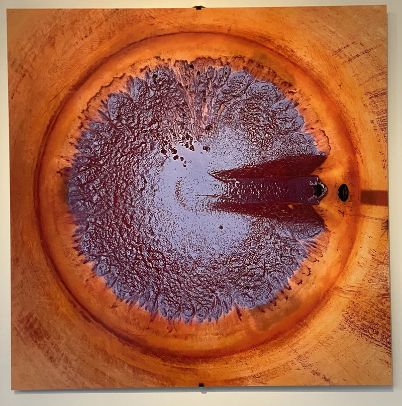 Construite selon le même principe, la deuxième met d’avantage l’accent sur le bord cuivré de la cuve. Ce dernier devient l’écrin flamboyant d’un cœur violet clair. Le centre lisse et peu nuancé se craquelle en périphérie comme une terre desséchée au soleil. Un rouge bordeaux trace les fissures et dessine des ailes symétriques sur la structure latérale droite, ajoutant texture et variété. Un point noir oblong, posé sur cet axe de symétrie, ponctue l’image et en brise la prévisibilité.
