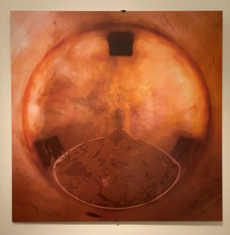 La dernière œuvre demeure énigmatique : reflets suggérant une sphère dorée, aussitôt démentie par le liquide ourlé de rose en bas ; une pellicule plus claire y flotte et marbre la surface. Trois carrés sombres structurent discrètement l’ensemble, baigné dans des tons chauds – rose clair, jaune-orangé, bruns d’argile jusqu’au brun foncé. C’est tout simplement beau.