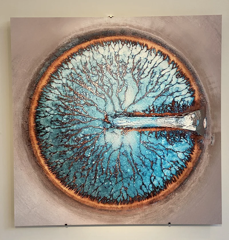 Imaginons la photo pivotée de 90° et recadrée en rectangle : la magie de l’iris s’évanouit, un arbre naïf sur fond de ciel apparaît. Le choix rigoureux du disque inscrit dans un carré uniforme neutralise justement toute anecdote figurative, toute référence d’échelle, et garantit la cohérence de la série.