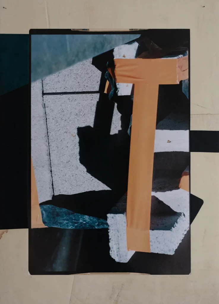La première composition interpelle : où se situe la réalité et l’intervention de l’artiste ? Son contraste graphique, ombres noires sur sol granité clair, frappe immédiatement. Toute la couleur est dans ce T orange pâle incliné qui structure l’image et ces deux petites formes de même couleur qui l’équilibrent. Un grand triangle gris-bleu légèrement flou dialogue avec une forme allongée minérale plus nette. On sent la jubilation du photographe pour la couleur qui émerge du quotidien. L’inversion des contrastes noir/blanc au bord droit dynamise l’ensemble ; l’association gris-bleu/orange pâle est particulièrement séduisante.