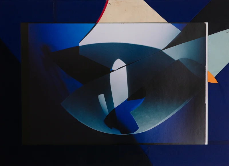 La deuxième composition, d’emblée très différente, est toute en rondeur. Les formes se prolongent sur le cadre en changeant de couleur. En haut à gauche, un bleu vif perd de sa superbe en passant sur le cadre, comme s’il avait cédé son intensité chromatique à la courbe rouge qui en dessine le contour. À droite, un orange tonique pousse le regard hors du cadre, pour le ramener plus bas vers une forme complexe bleu outremer. Orange/bleu, grand classique, fonctionne ici à merveille, dans ce qui semble être une maquette de papiers découpés éclairés, générant ombres, ouvertures et lumières.
