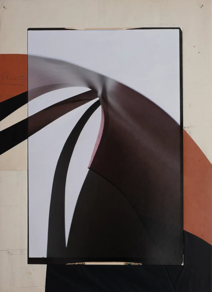 La troisième composition, magnifique de simplicité, évoque une architecture ou une affiche des années 50: contrastes noir/blanc dans des courbes dynamiques, et une seule couleur, un rouge acajou qui surgit hors du cadre.