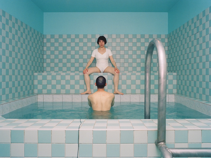 La deuxième évoque irrésistiblement Wes Anderson : composition centrée, palette pastel restreinte, surprise et invention. La position à la fois provocante et chaste du modèle en face de son compagnon faux-voyeur amuse. Bien vu l’artiste, en présentant cette photo dans le programme du festival, elle m’a hameçonnée! J’aime ces ambiances de thermes; on en retrouve d’ailleurs dans une autre photographie où des bassins jaune vif servent de contrepoint à un immense décor-peint de montagnes. Martin Parr n’est pas loin.