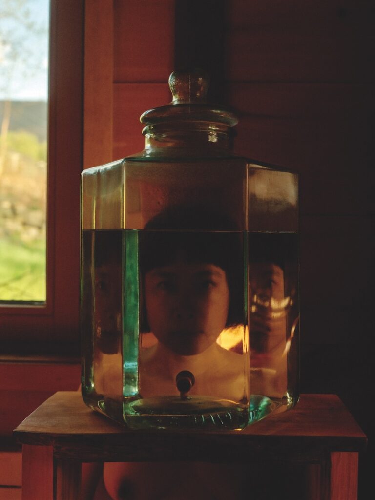 La première me trouble : Pixy derrière un grand flacon hexagonal, comme si elle nous offrait sa tête dans un bocal. Le trouble naît peut-être de la duplication partielle du visage de part et d’autre, barré par une ombre centrale. J’adore le reflet vertical jade à gauche du visage, écho chromatique à une fenêtre sans doute hors-champ. La teinte cuivrée du corps par ailleurs fait une belle transition chromatique avec le travail de Jean-Bernard Métais vu plus tôt.