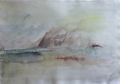 Dans l’aquarelle ci-dessous, j’ai tenté de reproduire la palette d’une aquarelle de Turner, « Ehrenbreiststein 1841 ». Je n’ai pas trouvé d’image sur la toile qui corresponde à la reproduction qui m’a servi de base pour la copie, ni au souvenir que j’ai des aquarelles de Turner.