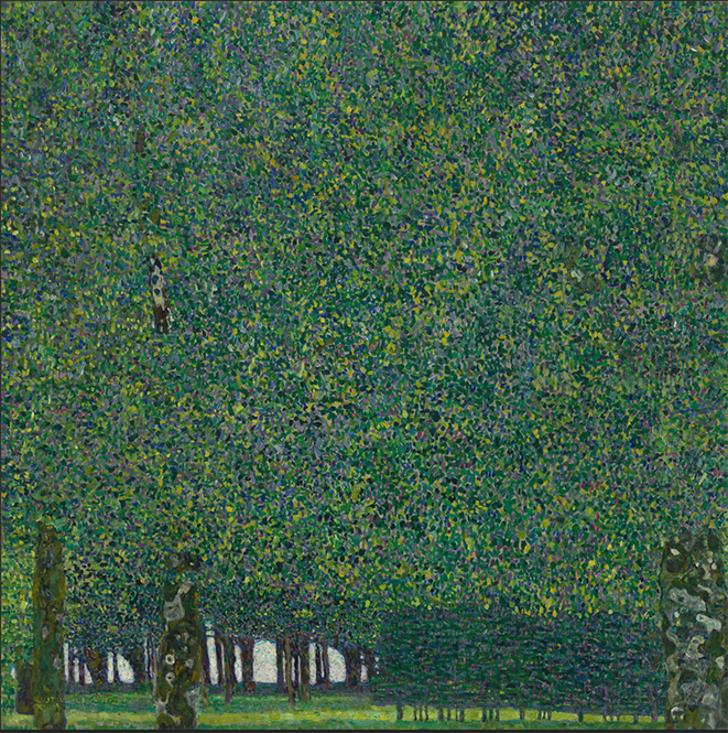 Quant à une palette restreinte où le vert domine, les jardins de Gustave Klimt nous offrent de beaux exemples, et en particulier ce tableau intitulé « Le parc du château de Kammer ».