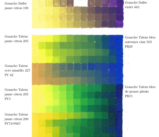 Voyez les nuances de vert qui peuvent être produites au départ de jaune (citron, orangé ou ocre) et de bleu (outremer, phtalo).