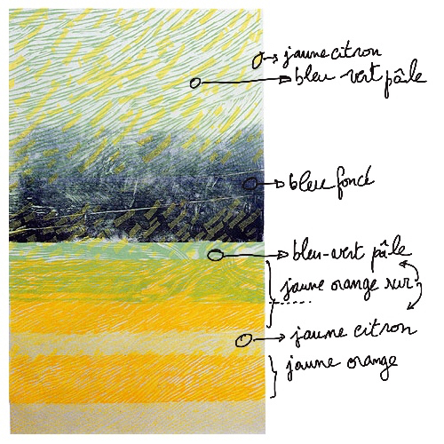 Voyez aussi comment le rythme du geste gravé influence la perception de la couleur. En haut de l’image, le rythme du jaune-orangé sur le celui plus dense du bleu-vert pâle donne l’illusion d’une nouvelle couleur.