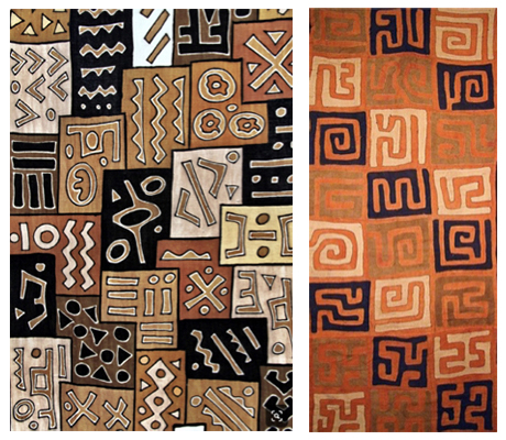 Les textiles africains, souvent très graphiques, que ce soit des velours du Kasaï ou plus généralement des textiles du royaume de Kuba (à droite ci-dessous), ou encore les tissus bogolans du Mali (à gauche) présentent de magnifiques palettes dans des couleurs terre. À nouveau, des zones plus neutres aèrent la composition et rythment l’ensemble.