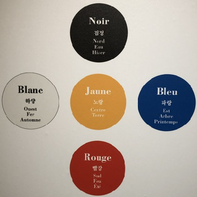 Le système des couleurs traditionnelles de Corée me semble idéal pour transmettre mes vœux. J’aime l’idée qu’il soit associé à une boussole; en ce début d’année il est utile de faire le point, de voir où l’on va, voire de se réorienter. Aussi, la symbolique des cinq éléments nous rattache à l’essentiel. Enfin transmettre le message qu’un système peut être différent du nôtre, que la notion d’harmonie est aussi culturelle, me séduit.