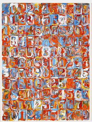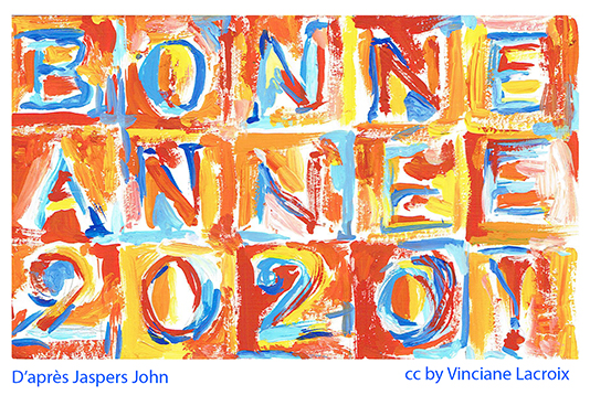Pour rédiger un message personnel, j’essaie souvent de trouver un lien avec l’illustration que j’envoie; une carte graphique très colorée m’inspire toujours. Certains peintres, comme Jaspers Johns, jouent de manière très picturale avec les chiffres et les lettres. Le tableau ci-dessous en est une belle illustration.