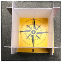 Les couleurs cardinales blanc, rouge, bleu, noir, seront dès lors sur chacune des quatre faces du cube-carte-de-voeu. Ce dernier, aplati lors de l’envoi, mettra en évidence les harmonies coréennes. Chaque face aura un chiffre; le blanc doit commencer puisqu’il est la base des couleurs selon ce système. À la réception, le destinataire placera le montage sur le carré jaune où figure une boussole, le chiffre deux blanc, sera situé en direction de l’ouest.