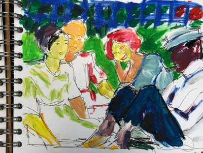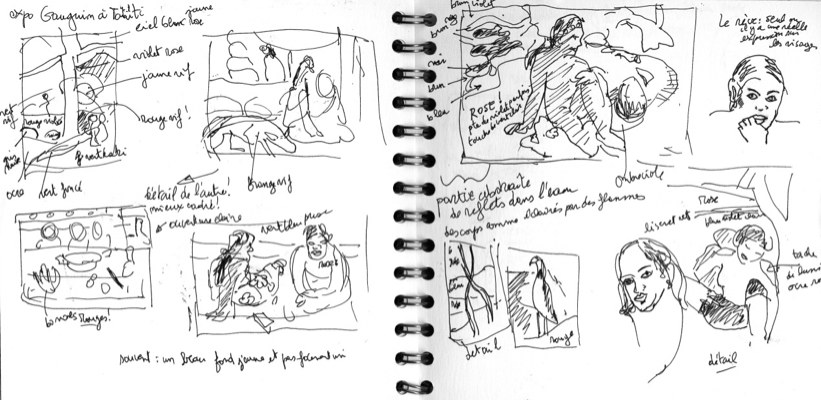 On est souvent surpris de l’audace des grands coloristes; ils n’hésitent pas à peindre un visage en vert, un ciel en jaune, des arbres en bleu. L’observer et le noter m’a aidée à explorer des pistes plus expressives. Ici encore j’ai fait des croquis de tableau pour noter la composition et j’ai noté les endroits où les couleurs me semblaient particulières.