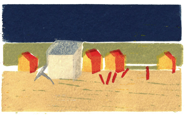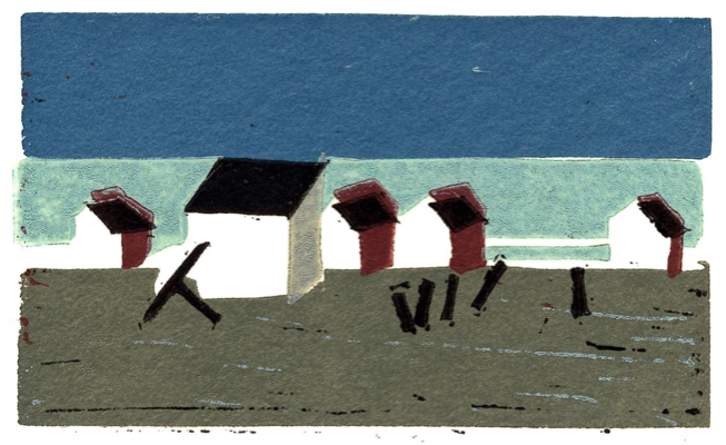 La linogravure tout comme la sérigraphie, se prête particulièrement aux recherches de couleur: il suffit de changer la couleur d’une planche ou d’un écran et le résultat créera une atmosphère différente. Pour mes linogravures de la Mer du Nord, quelques essais préparatoires me donnaient des pistes à explorer.